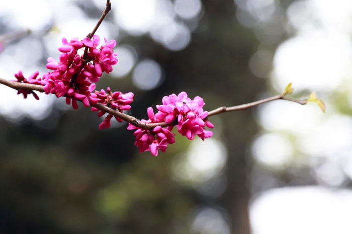 紫荆的花大多着生在新生的枝上,紧贴着枝干,远远望去,如京戏里穆桂英的头饰,向天直上。入夏后,紫荆生出平展的心形圆叶,叶脉清晰。待结了荚果,便充分显露出它豆科的本性。