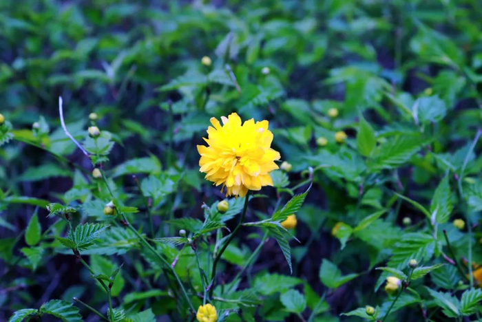 棣棠花在春风的吹拂中花枝轻颤,似十七八岁的少女,青春花开,爱在心内。丁家桥校区的棣棠花被围成半圆的灌木很是茂密,不但有单瓣的,还有重瓣的,色彩也多样,从黄到白,乃至混色的皆有。8月下旬,新生报到的时候,棣棠花会再次开放。与红花檵木一样,一年两次花期,只是秋季的花数量较少,只在枝条的顶端有一些。