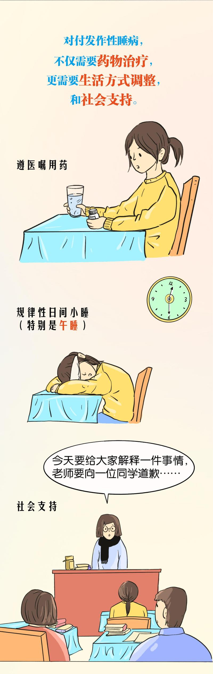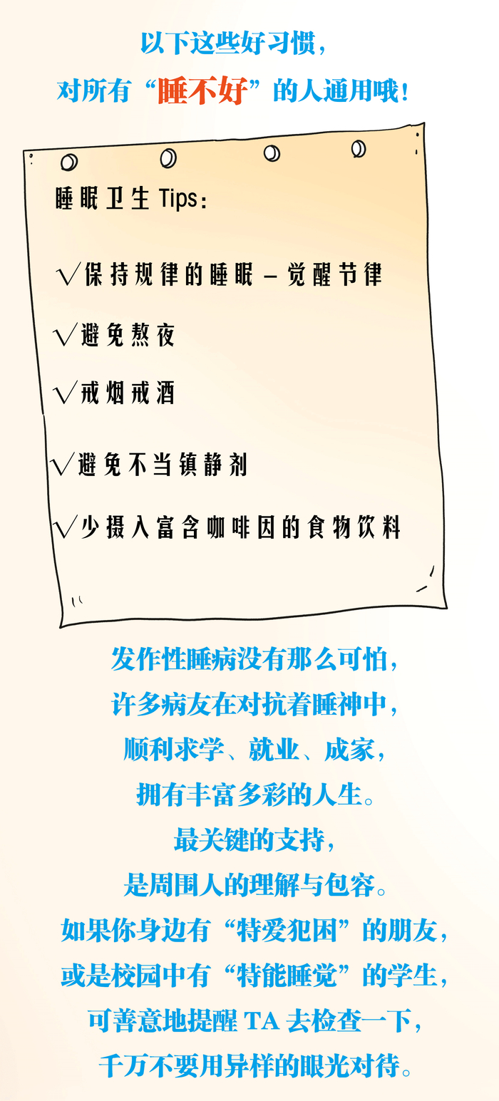 没错,发作性睡病虽然不可治愈,但可以通过药物和调整生活方式进行治疗。把生活安排得丰富起来,白天多小憩、注意控制情绪、加强运动,病情就可以得到缓解,只要注意危险,避免高危运动和工作,大部分患者经过有效治疗,都可以正常地工作和学习。所以,遇到“特爱犯困”或“特能睡觉”的朋友,千万不要用异样的眼光对待,可以善意地提醒对方去检查一下,他们需要我们的理解与包容。