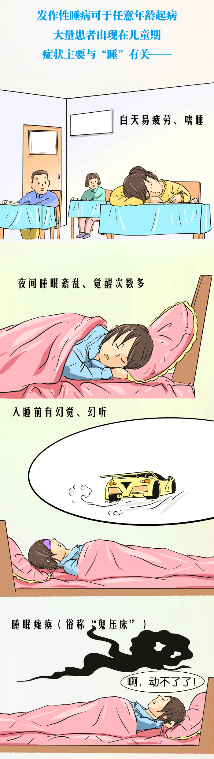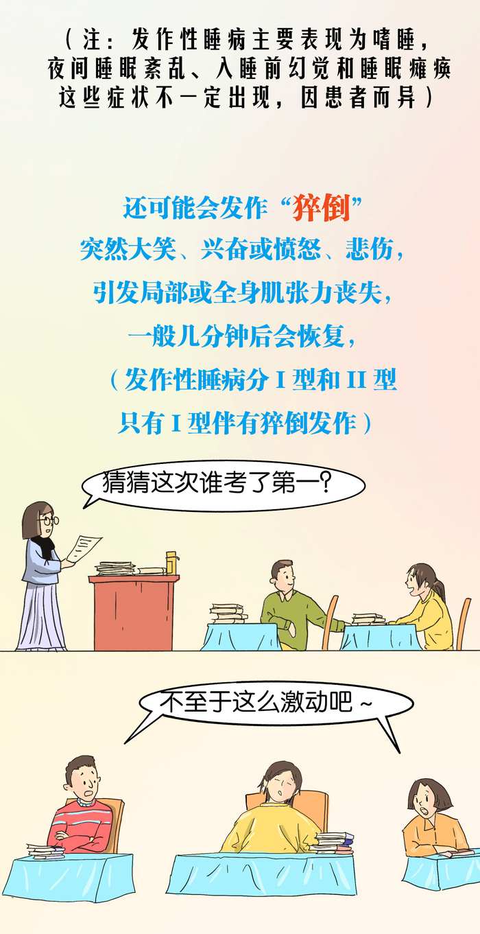 这是一种罕见的慢性疾病,得了这种病的人,即使是白天,也可能不分时间、不分场合、不可抵挡地多次进入睡眠;与此同时,入睡前和觉醒前可能会有生动的幻觉,让患者无法区分梦境与现实;即使睡着了,还要忍受睡眠瘫痪的频发干扰,即俗称的“鬼压床”;另外,情绪受到刺激时,部分肌肉还会失去张力,严重一些的身体就会像挂线木偶一样无力,被称为“猝倒”。