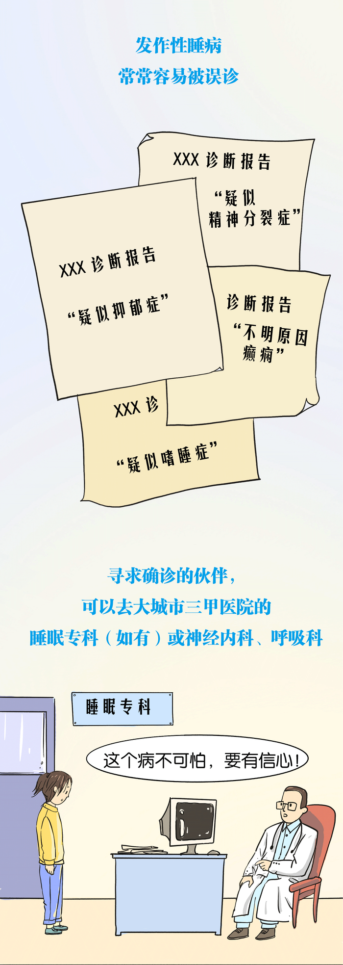 有的患者,因为不知道自己是病人,选择了高危或者需要长期集中精力的工作,给自己和他人都带来了极大的安全隐患:开车时突然睡着,差点追尾送命;正在流水线上忙碌,转头睡着,险些酿成大事故;突然猝倒,摔得青一块紫一块……