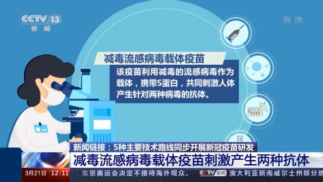 路线五:减毒流感病毒载体疫苗。该疫苗利用减毒的流感病毒作为载体,携带S蛋白,共同刺激人体产生针对两种病毒的抗体。