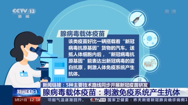路线二:腺病毒载体疫苗。腺病毒载体疫苗好比一辆搭载着“新冠病毒抗原基因”货物的汽车。送抵人体细胞内后,“新冠病毒抗原基因”既不会自我复制,也没有致病能力,却能表达出新冠病毒的蛋白抗原,刺激人体免疫系统产生抗体。 这类疫苗只打一针,代表产品是国内附条件上市的天津康希诺公司生产的5型腺病毒载体疫苗。