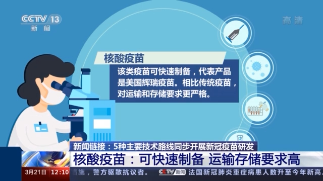 路线四:核酸疫苗。该类疫苗可快速制备,代表产品是美国辉瑞疫苗。相比传统疫苗,对运输和存储要求更严格。根据美国食品和药物管理局最新的规定,辉瑞疫苗在零下20摄氏度上下的常规药用冰箱内存放不能超过两周。一旦解冻,辉瑞疫苗在2摄氏度至8摄氏度环境中存放不超过5天,在室温环境存放不能超过2小时。