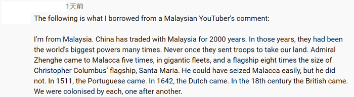 在众多的评论中,有一条转述马来西亚人的评论,通过一段历史事实陈述了中国和平外交的观念。