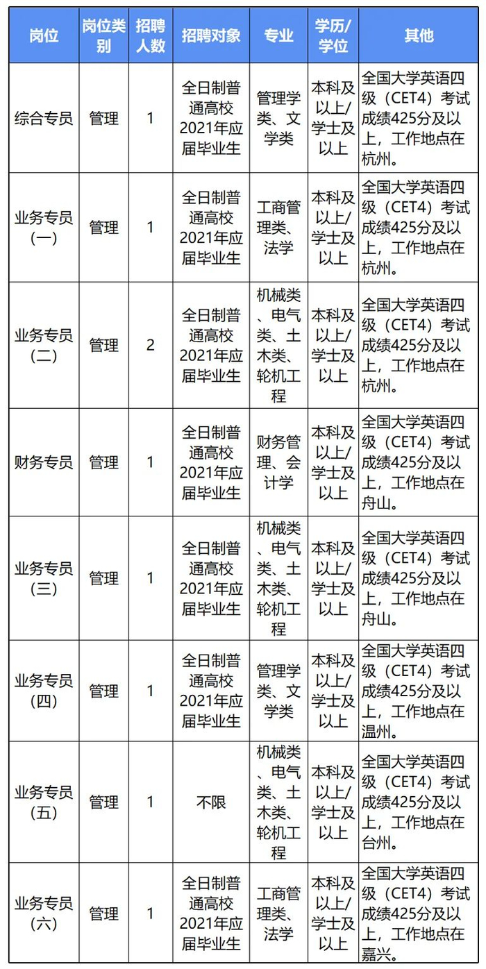 浙江海事局后勤管理中心为中央机构编制委员会办公室批准成立的财政补助事业单位,主要承担浙江海事局后勤管理职责。本次招聘需求为8个岗位共9人。其中,工作地点在杭州的4人,在舟山的2人,在温州的1人,在台州的1人,在嘉兴的1人。