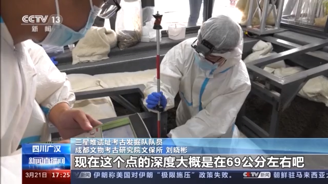 三星堆遗址考古发掘队队员、成都文物考古研究院文保所 刘晓彬:现在这个点的深度是在69公分左右,因为下面这个平面它不是一个绝对的平面,在这个深度左右的话就需要借助这样一个特制的,专门为它做的这样一个平台来辅助我们进行清理和发掘工作。