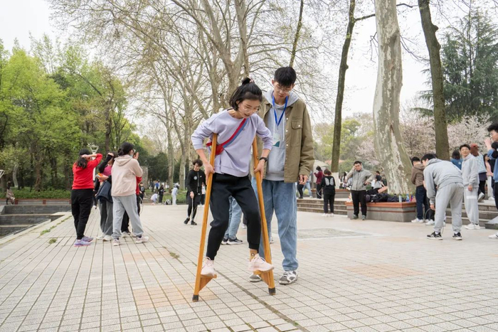 推铁环、打陀螺、踩高跷、踢毽子、呼啦圈……行政楼前青年湖平台上,民间体育与休闲运动同样热闹非凡。踩高跷是北方盛行的一种群众性技艺表演,许多体验者都是第一次参与,他们踩着高跷,在工作人员的帮助下小心翼翼地往前迈步。滚铁环现场,大家用长柄钩住铁环,通过手上力量控制住铁环平衡,促使其向前滚动。不远处,上下飞舞的毽子和有节奏转动的呼啦圈则尽显了每个人的青春与活力。植物科学技术学院杨国正老师与同学们围成一个圈,配合着轮流踢毽子,欢快的笑声从未停止。杨国正还手把手教同学们如何滚铁环、打陀螺, “杨老师十分和蔼,与我们关系都很好,今天这样的体验真的很棒。”研究生江宜池边说边用相机记录着老师和同学融乐的瞬间。
