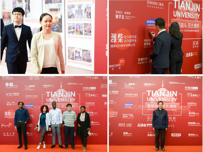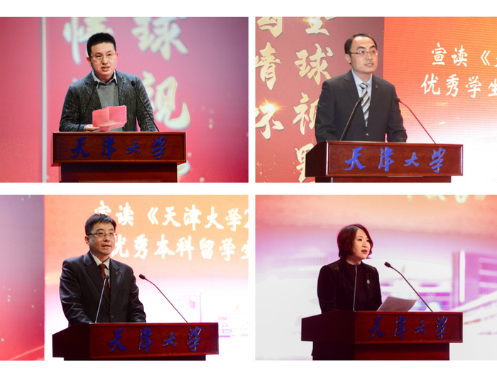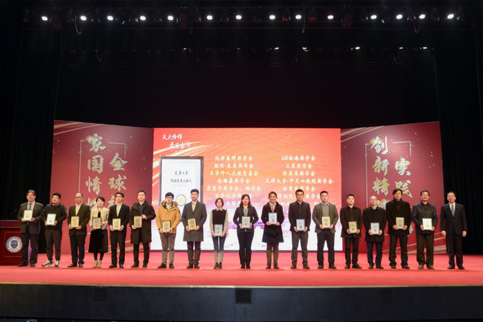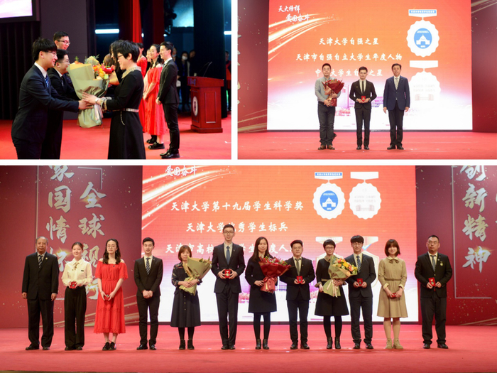 颁奖仪式环节,巩金龙、张力新、古瑶、贾启君与奖学金捐赠代表共同为获奖学生代表颁发了喜报和纪念章,肯定了过去一年学生取得的优异成绩。纪念章是为增强学生荣誉感和使命感,特别为获得省部级及以上奖、励学金的学生和10名天津大学优秀学生标兵获奖学生定制的“天津大学优秀学生纪念章”和“天津大学优秀学生标兵纪念章”。金光闪闪的纪念章上镌刻了实事求是的校训和“家国情怀、全球视野、创新能力、实践精神”的学校人才培养目标,也承载了学校和师长的殷切期盼与嘱托。