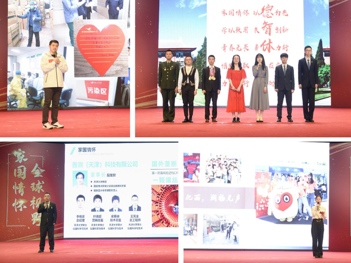 此次表彰大会设置了三个篇章,每个篇章的开始,由获奖学生中的典型人物进行榜样宣讲。“家国情怀 同心抗疫”篇章,作为医疗队员驰援武汉的药学院博士生骆达、为抗疫医护人员子女开展爱心家教的医学部本科生王语鹏、带领村里大学生投入基层防疫的材料学院硕士生许全军分享了他们同心抗疫的经历。“砥砺奋斗 百花齐放”篇章,让我们看到了天大学子德、智、体、美、劳各有所长,拼搏不止,奋斗不息的青春光芒。“资助育人 励志青春”篇章,有立志实业报国、攀越科研高峰的优秀学生标兵,也有成绩优秀、勤俭力行的自强之星;他们敏学如炬、万卷穷理,他们躬行如梯,专精于业,展现出天大学子的家国情怀和使命担当。