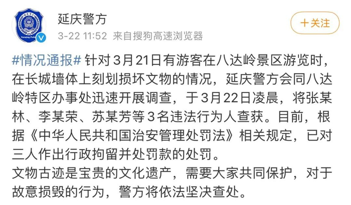 针对视频中的行为,八达岭长城官方当晚进行通报。通报称,初步判断游客使用的刻画工具可能为钥匙、铁丝或其他尖利物品,刻画的内容为游客姓名。目前,已经会同公安部门对相关情况进行调查取证。