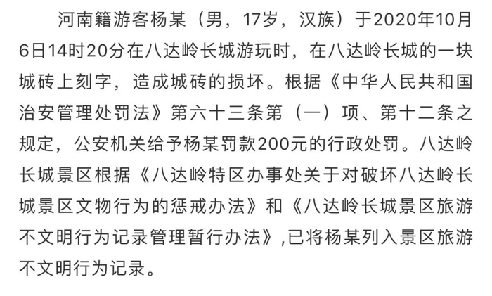 2020年10月6日,17岁游客杨某在八达岭长城游玩时,在长城的一块城砖上刻字,造成了城砖的损坏。