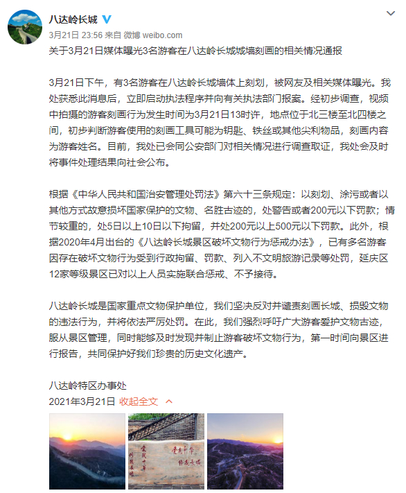 此外,自2020年4月6日起,《关于对破坏八达岭长城景区文物行为的惩戒办法》正式落地实施。《办法》中明确规定,对刻画、故意损坏等七类破坏文物行为,给予相应的行政处罚。