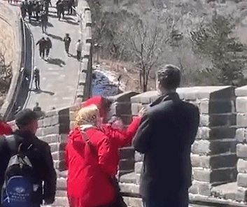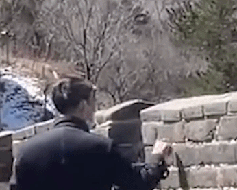 视频中,有三名游客在八达岭长城城墙上刻字。其中一名游客在“留名”后,将手中的“工具”递给同行的另一名游客。