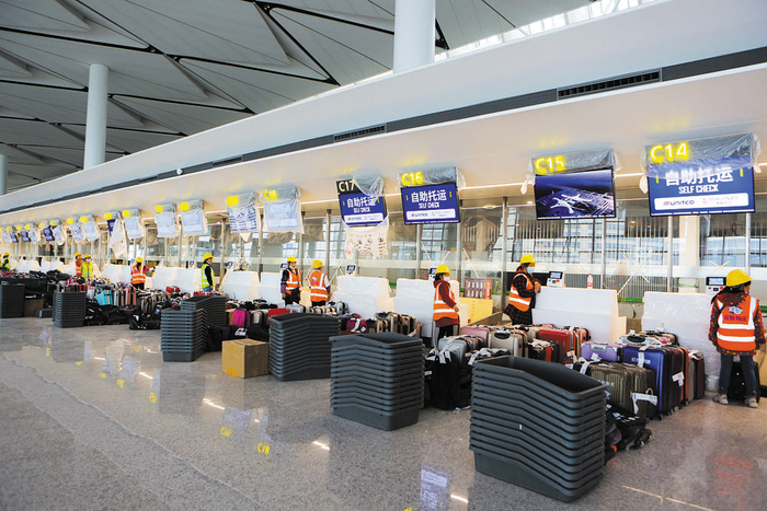 同时,成都天府国际机场还设计运用了多种智能自助设备,航站楼内还设计有自助值机、自助行李托运、智能安检等其他智能自助设施设备,帮助旅客快速通关,提高航站楼服务水准。在T1航站楼出发层,记者注意到大部分智能自助设施设备已安装到位,一排排行李箱摆放在值机柜台前,现场聚集着不少工作人员走流程,他们正忙碌着对设施设备进行演练和调试。(记者 杨富 摄影 张青青)