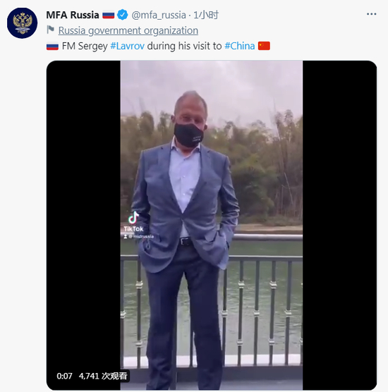 俄外交部在官方推特上发布了一段TikTok短视频,视频中拉夫罗夫站在镜头前,背后疑似为桂林山水,并配文“谢尔盖·拉夫罗夫外长在中国访问期间”。值得一提的是,这段短视频配乐正是许多中国人耳熟能详的歌曲《弯弯的月亮》。