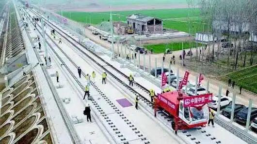 3月15日,在山东省济宁市日兰高铁铺轨基地施工现场,一组500米长钢轨由铺轨机牵引车缓缓牵出,平稳落在无砟轨道板上,标志着日兰高铁曲阜至菏泽段正式拉开铺轨序幕。
