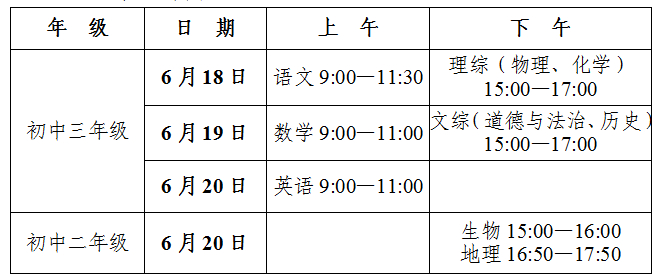 参照高考、学考时间安排,全市中考时间安排在6月18至20日,中考成绩7月3日揭晓。初中、高中学校录取工作于7月中旬开始。