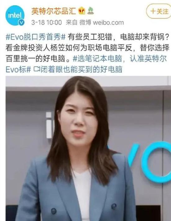 3月18日,英特尔笔记本官宣杨笠为其代言人。在宣传视频中,杨笠依然以一贯讲脱口秀的口吻和气场说着:“英特尔的眼光太高了,比我挑对象的眼光都高。”