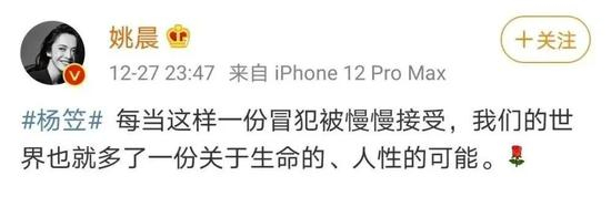 在此期间,不少明星站出来声援杨笠。2020年12月27日,女星姚晨发了一条微博称:“每当这样一份冒犯被慢慢接受,我们的世界也就多了一份关于生命的、人性的可能。”