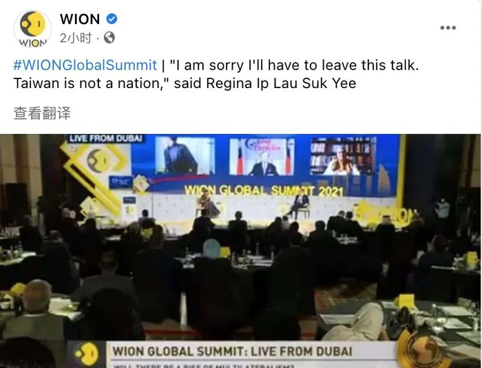 “WION TV 全球高峰会”则在脸书专页上分享了叶刘淑仪愤而离席的视频,并附以叶刘淑仪愤而离席前说的话,“抱歉,我必须离开这个论坛,因为台湾不是一个国家”。