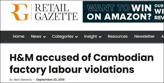 2016年,英国零售专业媒体《零售报》(Retal Gazette)援引柬埔寨劳工与人权联盟中心(Centre for Alliance of labour & Human Rights)的报告称,H&M在柬埔寨的三家“白金供应商”和一家“黄金供应商”都有侵权行为,工人们迟到几分钟就要被减薪,上厕所也受限制,病假严重不足,甚至还会在车间内晕倒。