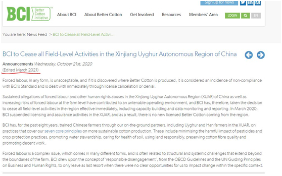 去年10月,BCI在官网首页发布声明:BCI将停止中国新疆维吾尔自治区的所有现场活动。