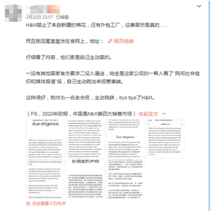 23日晚上,有博主爆料称H&M公司发声明,主动禁止了来自新疆的棉花和外包工厂。
