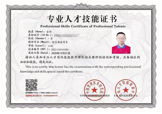雷科说,他在微信上添加了“Alice”之后,对方声称自己姓赵,并表示购买中国管理科学研究院职业教育研究所专业人才技能培训中心颁发的健美操指导员二级证书只用提供身份证正反面、正规照电子档即可,不用参与任何培训。