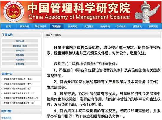 3月24日,澎湃新闻在中管院官网看到,在其下属机构一栏并未显示详细的二级机构的名单,取而代之的是一则说明:“凡属于我院正式的二级机构,均须按照统一规定、标准条件和程序,经重新审核认定并正式颁发文件后对外公布。”
