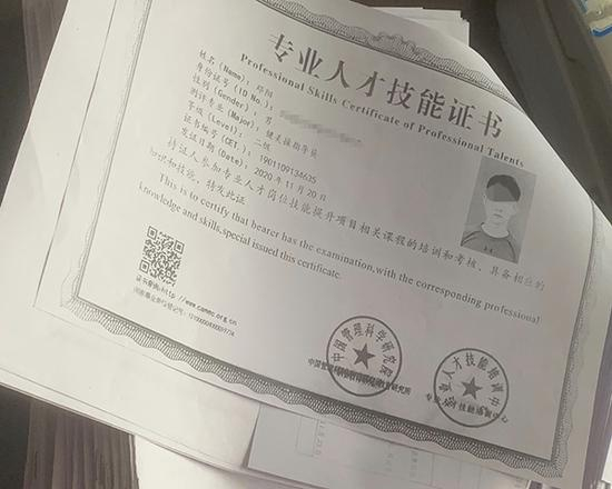 澎湃新闻注意到,这张抬头为“专业人才技能证书”的证书下方盖有“中国管理科学研究院”和“专业人才技能培训中心”的双重印章。