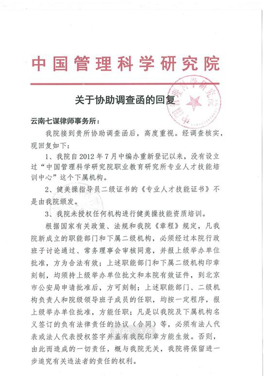 在经历六天的等待之后,中管院终于发来了回函。该院1月27日出具的书面答复称,该院接到律所协助调查函后,高度重视,经调查核实,该院自2012年7月中编办重新登记以来,没有设立过“中国管理科学研究院职业教育研究所人才技能培训中心”这一下属机构,案涉的健美操指导员二级证书的《专业人才技能证书》也不是由该院颁发。中管院称,他们从未授权任何机构进行健美操技能资质培训。