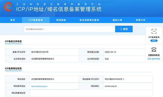 然而,澎湃新闻查询该所网站备案号却发现,其在工信部的备案主办单位名称为“北京管科新职教育科技中心”,单位性质为企业,并非事业单位。