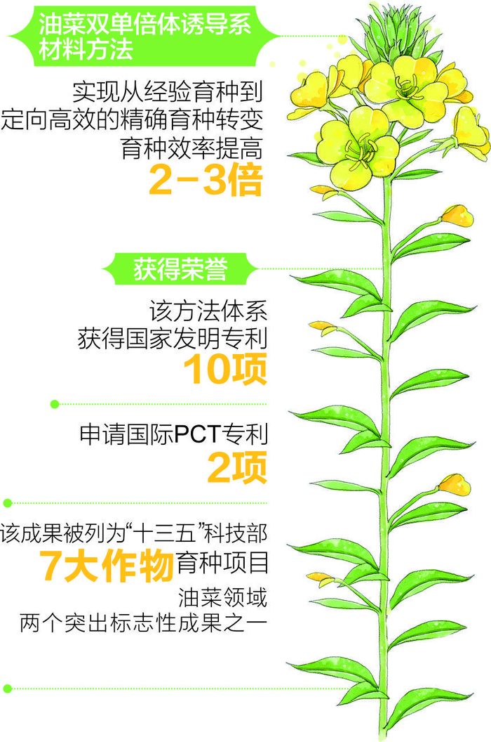 油菜双单倍体诱导系材料方法,被誉为育种中的“高铁技术”,这套方法体系也被全国45家大学及科研机构引进使用。该方法体系获得国家发明专利10项。申请国际PCT专利2项,进入美国、欧盟、加拿大、澳大利亚、日本、韩国、印度、泰国。该成果被列为“十三五”科技部7大作物育种项目,油菜领域两个突出标志性成果之一。