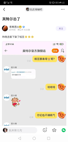 更早曝光的一张淘宝截图里,一位身份不明的买家与英特尔客服人员侮辱杨笠为“母狗”“母猪”。这张截图现已成为虎扑步行街杨笠相关话题的必用配图。