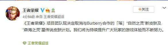 《王者荣耀》项目团队现决定取消与Burberry合作的‘瑶’“自然之灵”新皮肤及“森海之灵”星传说皮肤计划。我们将为持续提升广大玩家的游戏体验而不断努力。