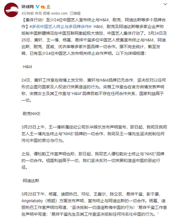 原标题:集体行动!至少24位中国艺人宣布终止与H&M、耐克、阿迪达斯等多个品牌合作