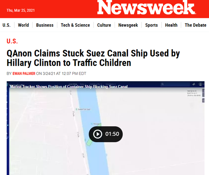 总之,一个中国台湾的大型货轮不慎在苏伊士运河搁浅的事情,就这样被美国这群极右翼网络阴谋论者“凭空编造”成了一个中国帮希拉里等美国吃人的恋童癖精英贩卖幼童的恐怖事件……