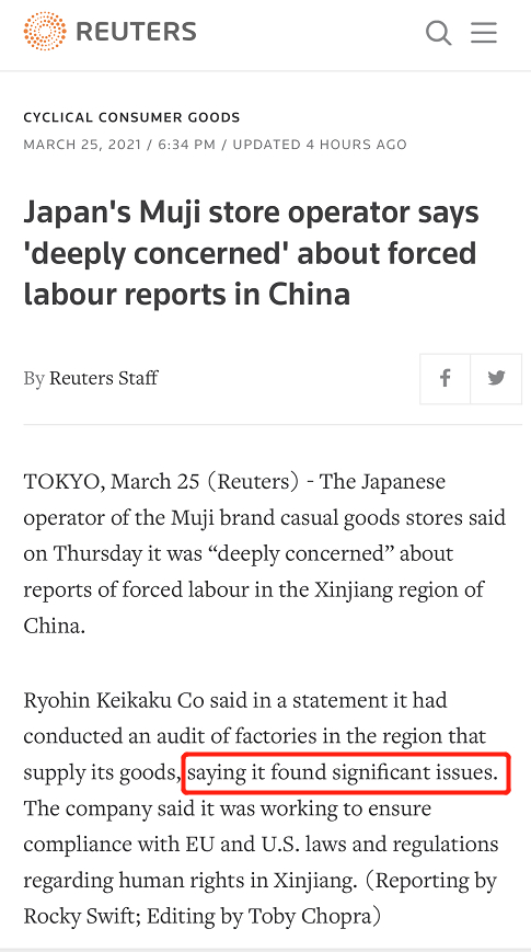 然后路透社今晚早些时候说,无印良品母公司良品计划株式会社(Ryohin Keikaku Co)25日发表一份声明,宣称“非常关切”中国新疆地区所谓“强迫劳动”的报道,该公司已对供应产品的新疆工厂进行查核,“发现明显问题”。报道提到,良品计划声明还称,正在设法确保该公司遵守欧盟及美国有关新疆人权的法律及规范。