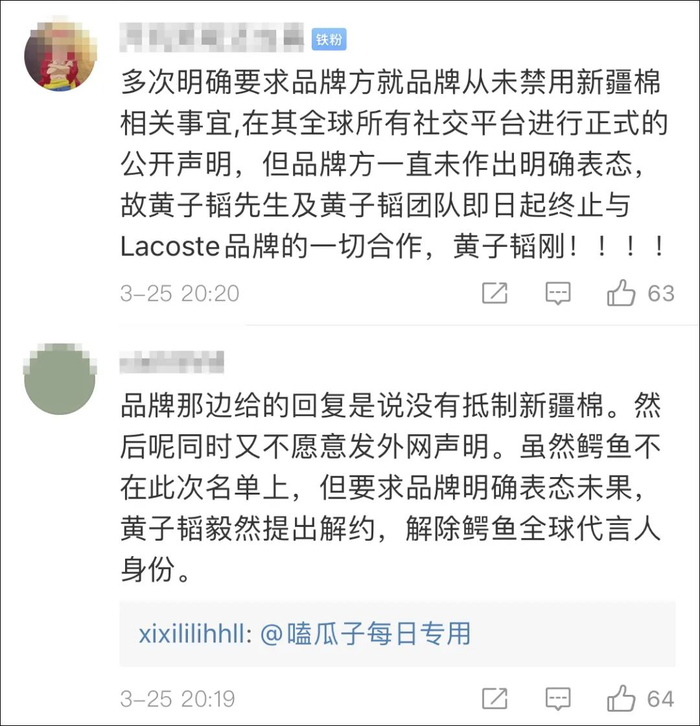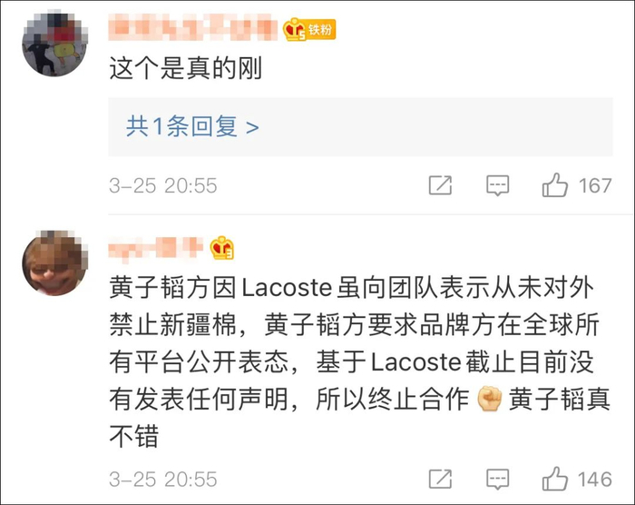 3月25日晚间,@黄子韬ZTAO工作室 发布声明表示,BCI组织造谣抹黑新疆棉花事件发生后,团队已第一时间与黄子韬代言品牌“Lacoste鳄鱼”核实确认,并于24日晚间收到了对方“未发过对外声明禁用新疆棉”的回复。