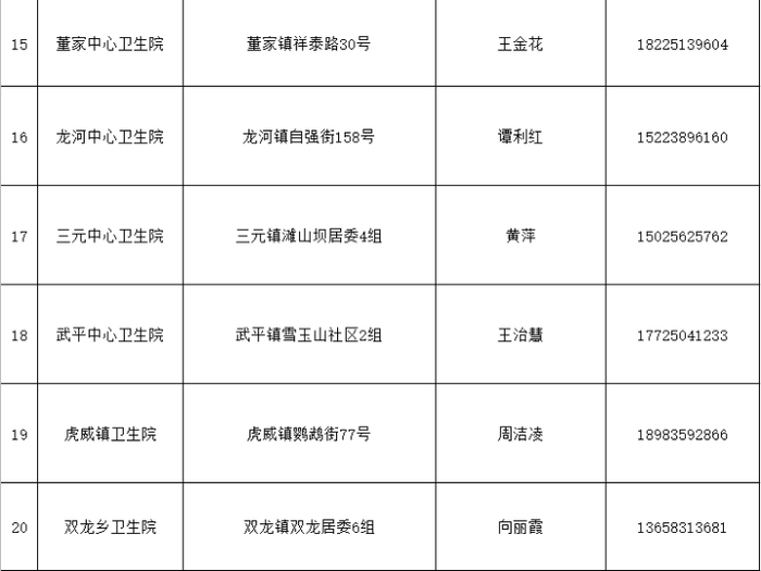 施家梁镇卫生院 | 施家梁镇陵峡南路265号 | 15808010758 |
