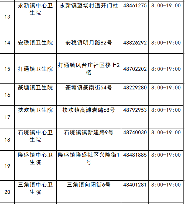 合川区除在城区设立区人民医院、区妇幼保健医院、合洲医院、宏仁医院、花滩医院、合阳城、南津街、东津沱、钓鱼城、申明亭社区卫生服务中心等10个接种点外,在城区以外的各街道社区卫生服务中心、中心卫生院、镇卫生院均设置了接种点,从8:30至19:00均可免费提供接种服务,周末照常上班。