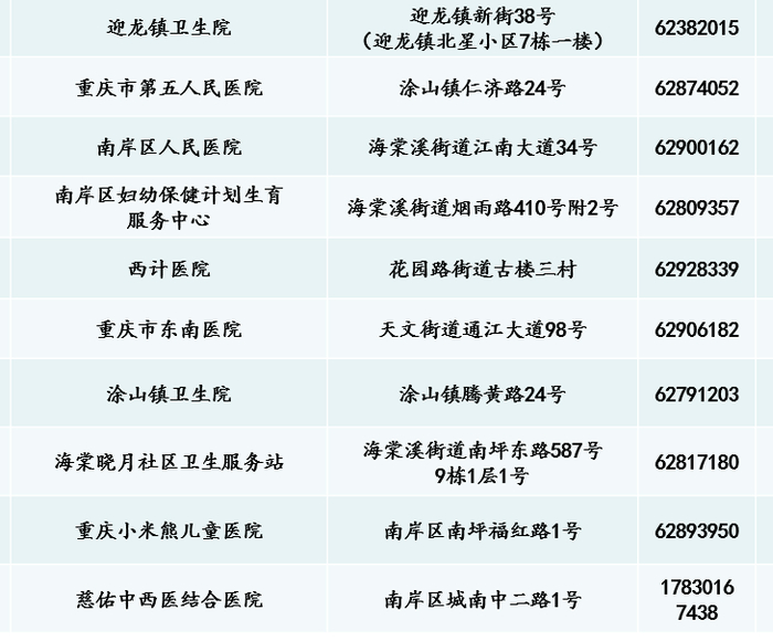 北碚区妇幼保健计划生育服务中心 | 北碚区鱼塘湾2号 | 86036853 |