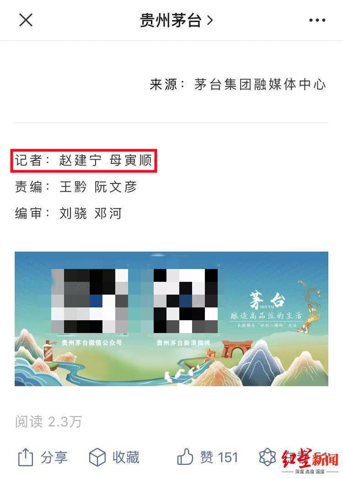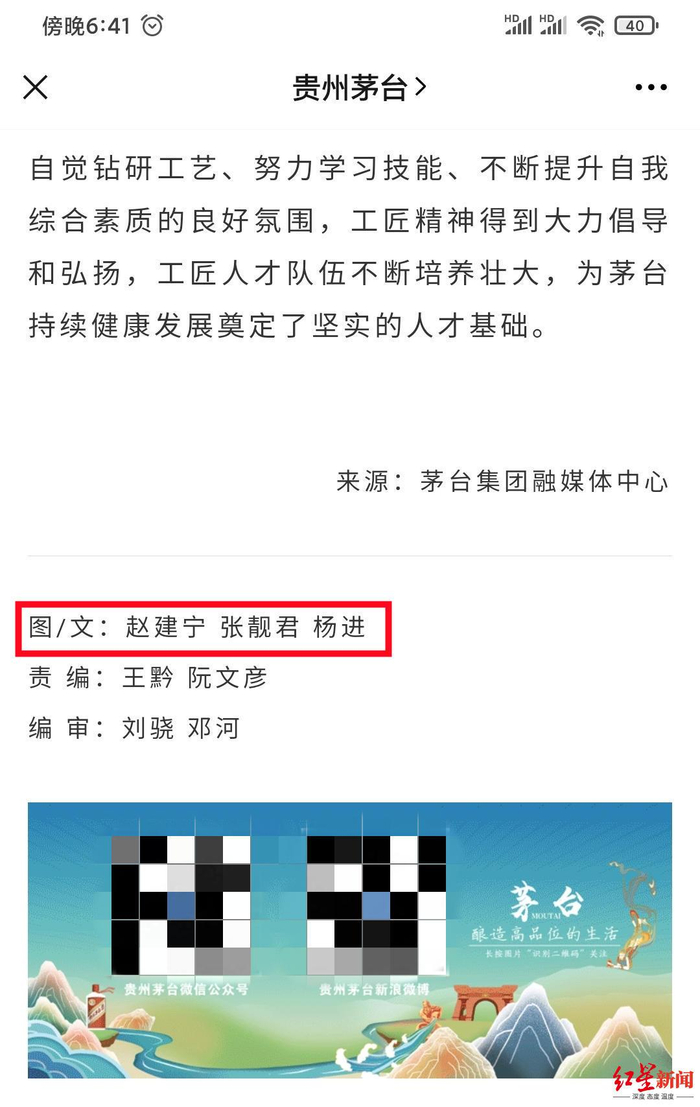 在被指出官方公众号署名“记者”存在问题后,茅台集团在其随后更新的文章里,也对相关问题迅速作出了改进。红星资本局注意到,在最新文章中,此前署名为记者的赵建宁,已经不再自称“记者”,而是署名“图文/赵建宁”。