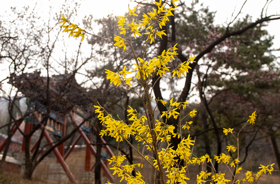 连翘多在建筑、亭子和甬路之旁,鲜艳的颜色形成点缀,与古建、古松相映成趣。