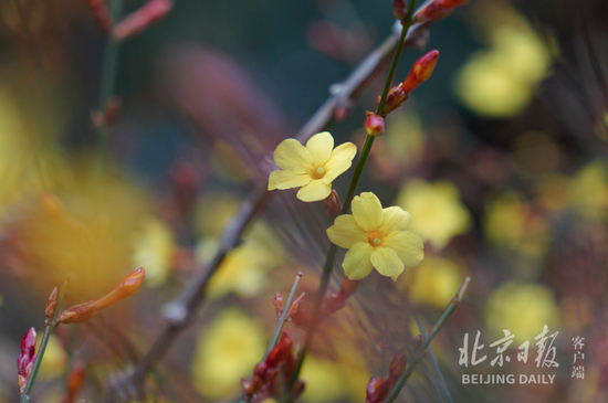 迎春花主要集中在南北主干道旁,与园林建筑、湖面、山石等相依,相映成趣。