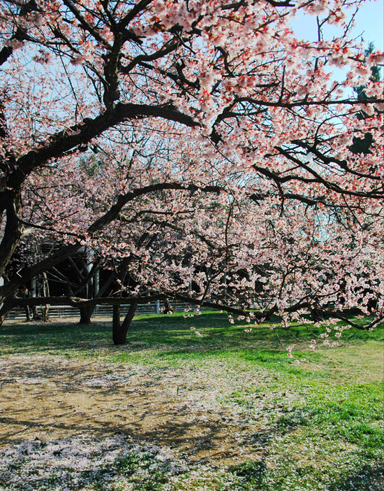 公园外坛西侧路十余株杏树一线排开,红蒂白花团团簇簇,掩映于亭、廊、松、柳间别有韵味儿。独有一株“陕梅杏”,似梅非梅,花开虽晚,但花蕾红艳圆润,一朵花就能藏着几十枚花瓣,初开粉红,盛开浅粉,小花球挂满枝头,惹人喜爱。