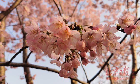 目前,北京植物园园区东南门至科普馆西侧沿线,数十株辽梅山杏已进入初花期,层层绽放犹如天边的粉色云团。