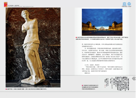 大家都知道,中国有秦俑,人们称之为“地下的军团”。法国总统希拉克参观之后说:“不看金字塔,不算真正到过埃及。不看秦俑,不算真正到过中国。”1987年,这一尘封了2000多年的中华文化珍品被列入世界文化遗产。中国还有大量文明成果被教科文组织列入世界文化遗产、世界非物质文化遗产、世界记忆遗产名录。这里,我要对教科文组织为保存和传播中华文明作出的贡献,表示衷心的感谢!
