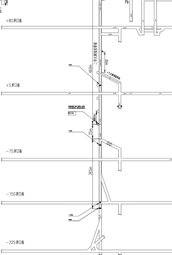 7。其他情况。二号大倾角胶带巷–75m—–225m段未见燃烧痕迹,仅见底板部分浮煤浮矸,机尾堆积下滑的未着火胶带磨损痕迹明显,胶带巷浮煤浮矸堆积,–75—+5m段尤其突出;–225m机尾段未见燃烧痕迹,仅见底板部分浮煤浮矸;胶带因断裂下滑至机尾,导致机尾座下滑10余m;现场可见胶带磨损痕迹。